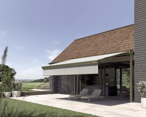 Durch die fassadenunabhängige Montage erfüllt das Freigestell auch den Wunsch nach der Traummarkise bei Renovierungen denkmalgeschützer Gebäude, Fertighäusern und anderen komplexen statischen Gegebenheiten.